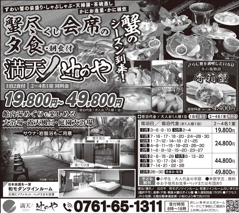 本日、北國新聞に公告掲載のプランは、ずわい蟹の姿盛り・しゃぶしゃぶ・天婦羅・茶碗蒸しに、かに雑炊などカニ尽くしの夕食で19,800円~!!